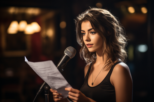 20 year old girl behind a microphone, reading from a piece of paper --s 200 --ar 3:2