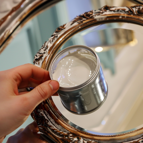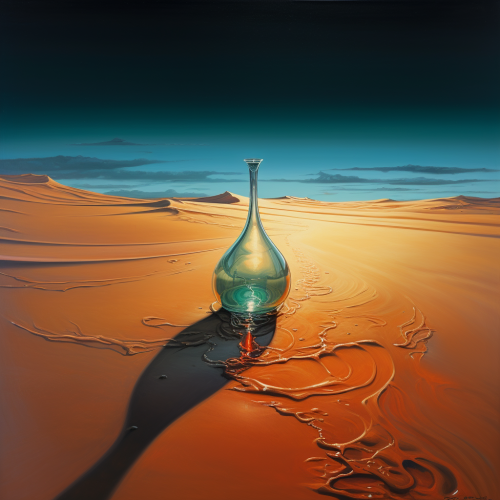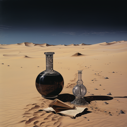 Painting of a magical potion on the ground in a desolate desert, sand dunes, 1970's surrealist dark fantasy art style, book cover art, realist: lifelike accuracy, volumetric lighting, --ar 1:1 --style raw