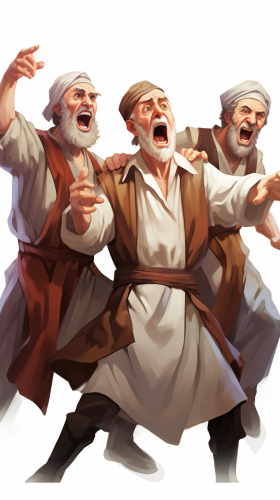 Hebrew Priests angry and yelling at the Romans, in the style of digital painting, storybook illustrations, himalayan art, anime-inspired characters, raphael, fernando amorsolo, jeff kinney, white background --ar 9:16