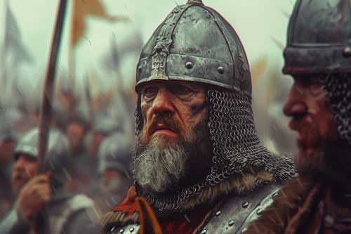A detailed oil painting of a King and Duke in serious conversation on a battlefield, close-up view, their expressions intense and focused, soldiers chanting in the blurred background, 13th-14th century armored attire, on horseback, dramatic lighting emphasizes their regal features. Created Using: fine bristle brushes, chiaroscuro lighting, historical accuracy, dynamic composition, atmospheric perspective, rich color palette, detailed fabric textures, hd quality, natural look --ar 3:2 --v 6.0 --style raw