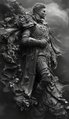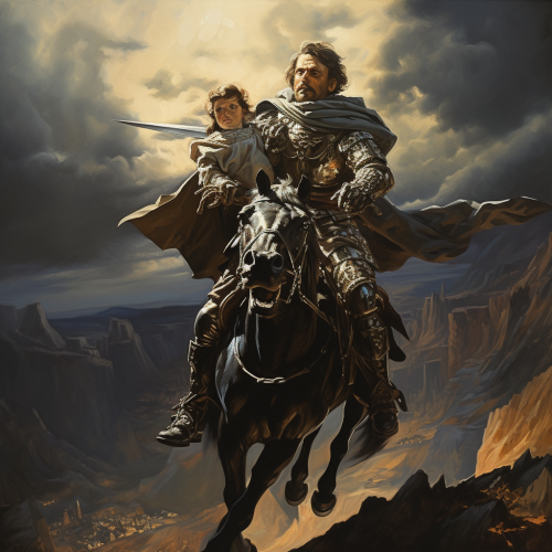 Painting of a knight carrying a barbarian in his arms while flying, 1970's surrealist dark fantasy art style, book cover art, realist: lifelike accuracy, volumetric lighting, --style raw --ar 1:1