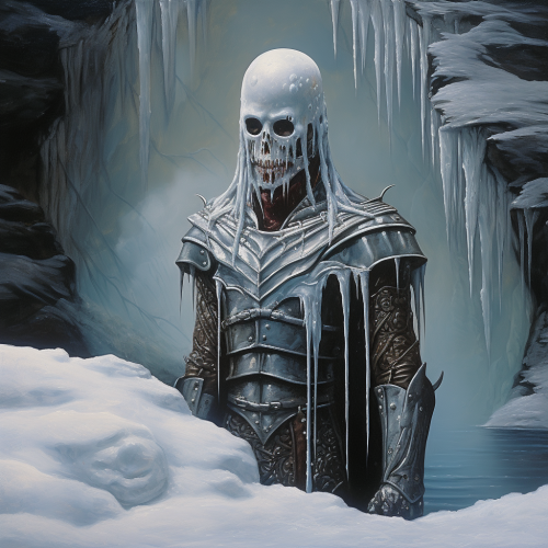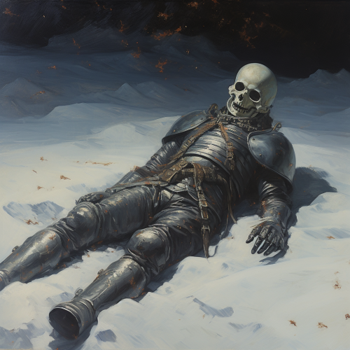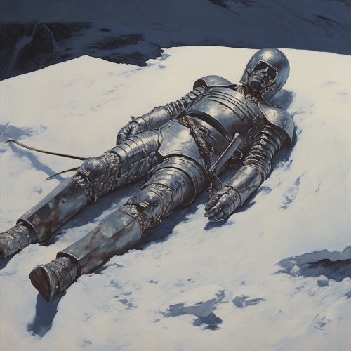 Painting of a knight covered in snow on the ground, laying horizontally, snowy tundra, baron land, top down view, 1970's surrealist dark fantasy art style, book cover art, realist: lifelike accuracy, volumetric lighting, --style raw --ar 1:1