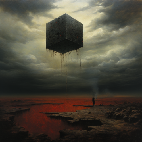 picture in style of painter Beksiński showing a cube levitating over apocalyptic empty landscape. Small pieces falling from the cube as a rain. Dramatic sky.