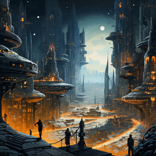 celestial cyberpunk city on the Moon. Claustrophobic, ethereal environment. futuristic sci-fi aesthetic. depicted as an oil painting