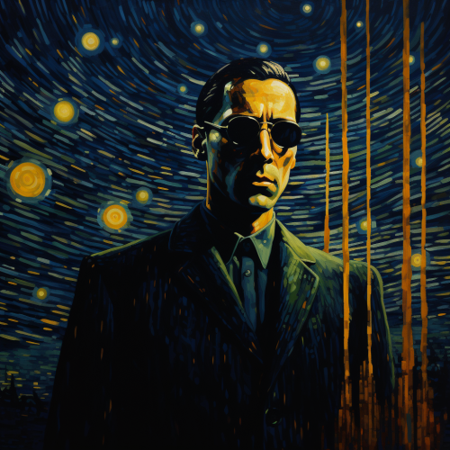 Depict the Matrix protagonist Neo in Van Gogh's starry night space.