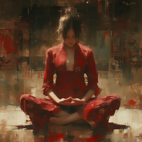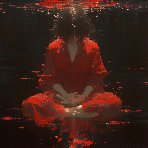 Oil on canvas, evaporating edges, an ethereal image of a meditating beautiful Chinese woman in red outfit, under water, the edges of the outfit are seemly blending into the sorrounding which is serene and dreamlike, uhd, an image that can be exhibited in the largest galleries --s 1000 --niji 6 --style raw