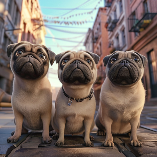 3 pugs side by side, sitting on a sidewalk, looking at the camera, pixar style --v 6.0 --ar 1:1