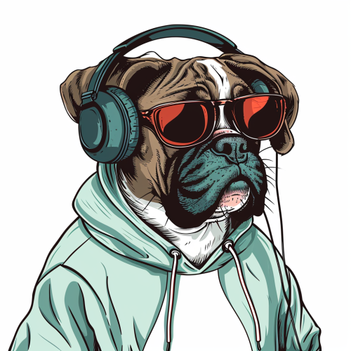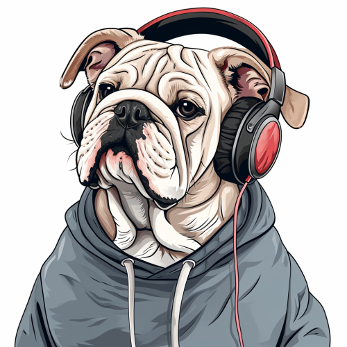 vector art, cute kawaii style with black outlines on a solid white background 4200x2988 px, an adult anglish bulldog wearing a sweatshirt and headphones --v 6.0