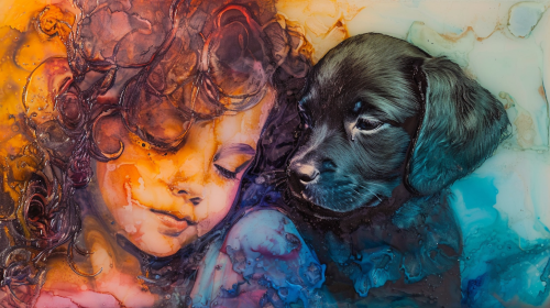 alcohol inks, little girl and puppy, encaustic art style --ar 16:9 --v 6.0