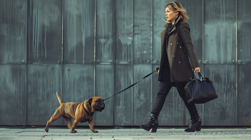 sideview of a woman walking, wearing officewear look, villain vibe, looking angry, with a angry dog on a leash --v 6.0 --ar 16:9