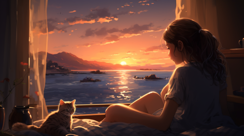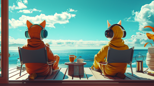 Anthropomorphic cat and anthropomorphic dog, wearing casual clothes and high-end wireless headphones, sitting in the center of a high-end high-end platform, 10 o'clock in the morning, looking at the sea view in the distance, with 2 cups of coffee next to them, high-end feel, rear view, 16k Image quality, --ar 16:9 --v 6.0