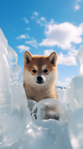 [0946bb6aa] black puppy Shiba Dog peeking out of a hole in the snow, in the style of realistic blue skies, photography installations, kawaii aesthetic, made of glass, cut and paste, icepunk, amber --v 5.2 --ar 9:16 --c 0