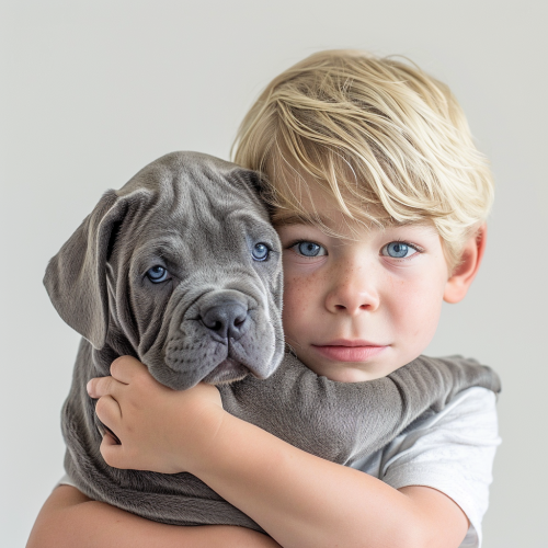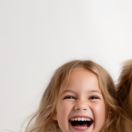 realistic 6 year-old American girl, with a dog, laughing, super happily, blonde, white background, rounded bob, Sony α7 III camera with a 85mm lens