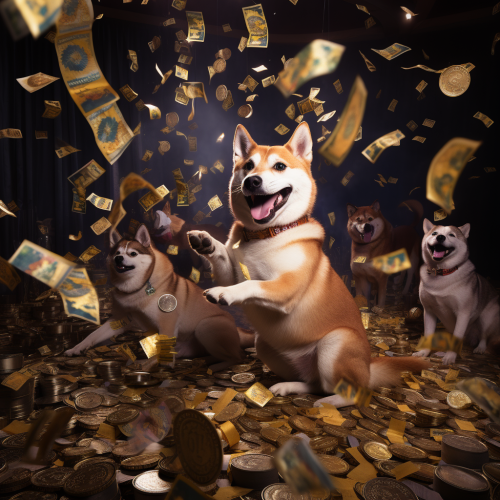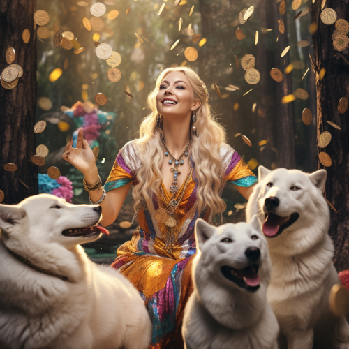 a beautiful blonde woman in her 50s surrounded by extremely happy husky dogs, in a psychedelic forest with gold coins raining down
