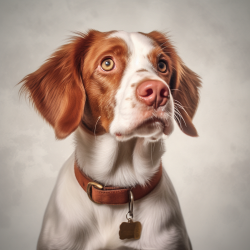 photorealistic Brittany spaniel curiously looking forward with head tilted to one side --v 5.1