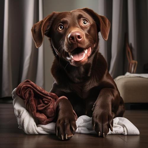 a chocolate coloured Labrador playing with a sock, photo Realistic