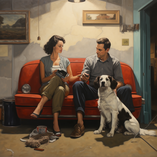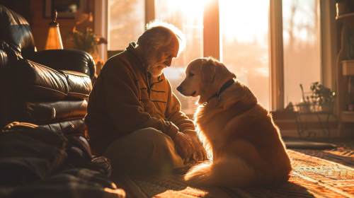 dog with man sitting on a carpeted floor morning sun Photography, high-resolution digital camera with a 50mm lens, --ar 16:9 --v 6.0