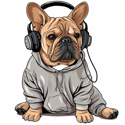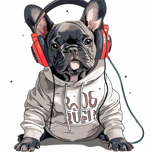 vector art, cute kawaii style with black outlines on a solid white background 4200x2988 px, an adult french bulldog wearing a sweatshirt and headphones --v 6.0