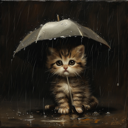 oil painting of a cute little kitten sitting under an umbrela its holding, dark background --v 6.0