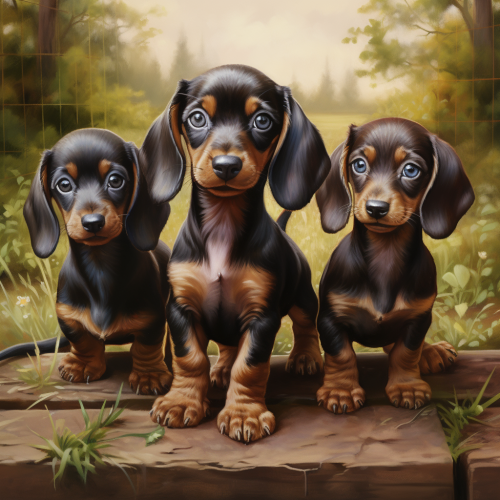 cute sausage dogs, at the park, realistic, 5 boys 2 girls