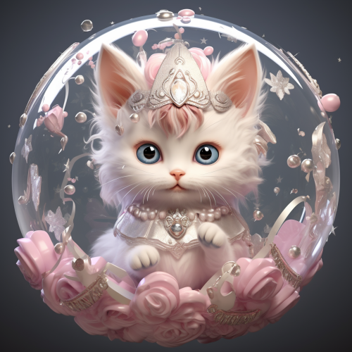 3D,4K,a cute white kitten with blue eyes wearing a golden crown inside a transparent bubble. The kitten is surrounded by an array of pink and gold hearts and stars that are both inside and outside the bubble. The name "Annie" in stylized pink lettering is prominently displayed in front of the kitten. The background is a muted grey color, making the vibrant colors of the elements in the foreground stand out. There are small piles of pink hearts at the base of the image