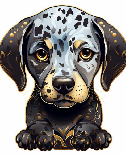dark color dalmatian puppy colors with golden elements, drawing style, mandala inside the body, white background sticker --ar 9:11