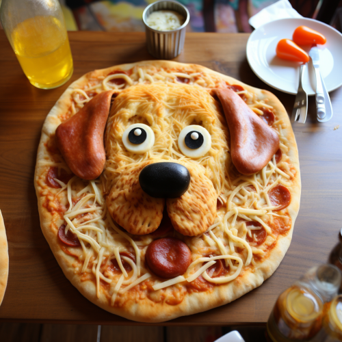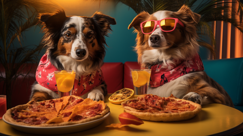 dogs with pizza, fashionable dogs with accesories, dogs eating pizza at California. Los Angeles --s 250 --ar 16:9