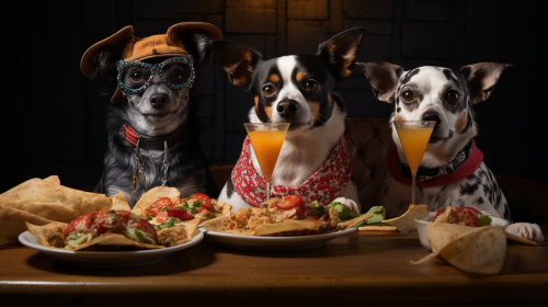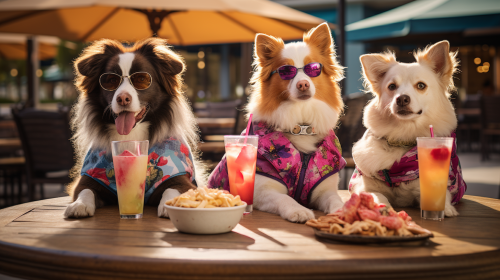 dogs and pizzas, fashionable dogs with accesories, at California Pizza Kitchen. Los Angeles --s 250 --ar 16:9