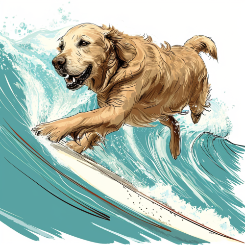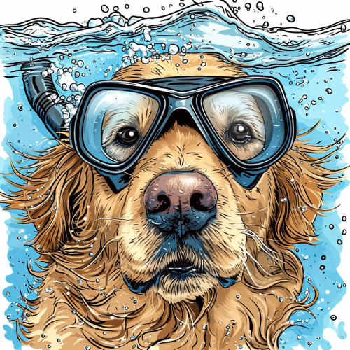 Vector art, colored pencil style, solid black outlines on a white background. A golden retriever scuba diving. --v 6.0