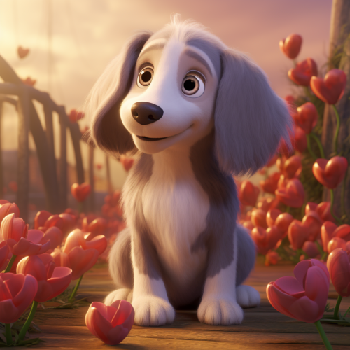 a long hair grey and white long hair dachshund puppy, full body, in a valentine scene, Disney pixar style