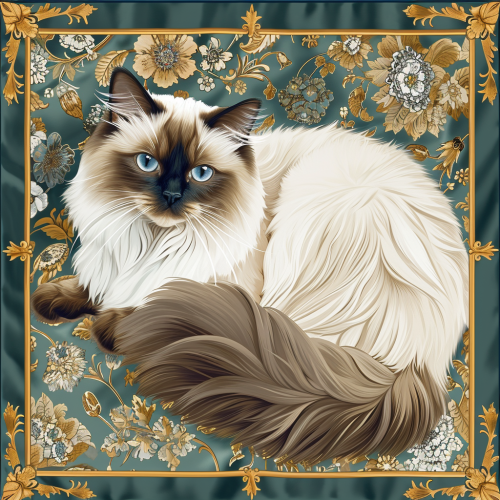 hermes inspired silk scarf design square. Have the design focus around a ragdoll breed cat using the litterbox. --v 6.0 --ar 1:1
