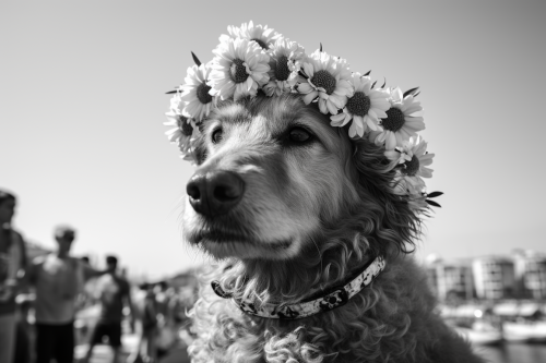 A lively scene unfolds by the sun-kissed shores of Izmir Foca as a charming dog, adorned with a floral wreath around its neck, engages in the heartwarming act of selling vibrant flowers. Captured through the lens of Elliott Erwitt, the photograph embraces a candid and whimsical perspective. Camera: Leica M10 Monochrom Camera Parameters: f/2.8, ISO 200, shutter speed 1/500 Lighting Style: Outdoor sunny warm light Fancy Words: Playful, candid, spontaneous, endearing, documentary, high-key, pet-friendly Orientation: --ar 3:2