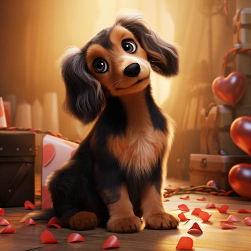 a long hair puppy dachshund that is black and tan and white, in a valentine scene, Disney Pixar style full body