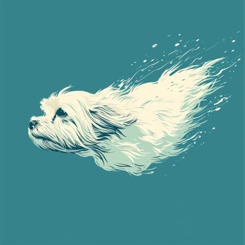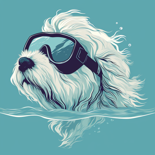 a simple illustration of the profile side of a shaggy long-haired maltese dog scuba diving on a solid background --v 6.0