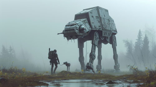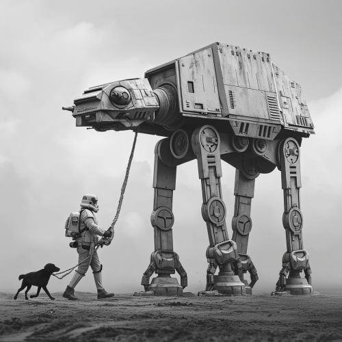 a man walking a dog sized ATAT like a pet dog. --ar 16:9 --v 6.0