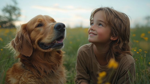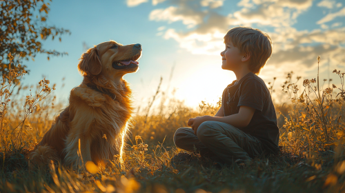low angle shot of a young boy and his golden retriever on a green field at 10am, beautiful grass field, boy is on his knees petting the dog, beautiful clear blue sky --ar 16:9 --q 2 --v 6.1 --s 750 --style raw