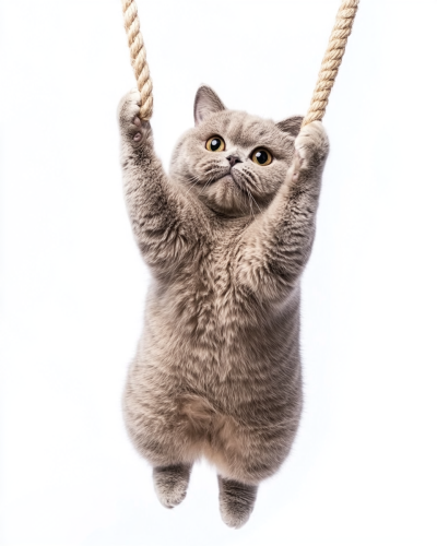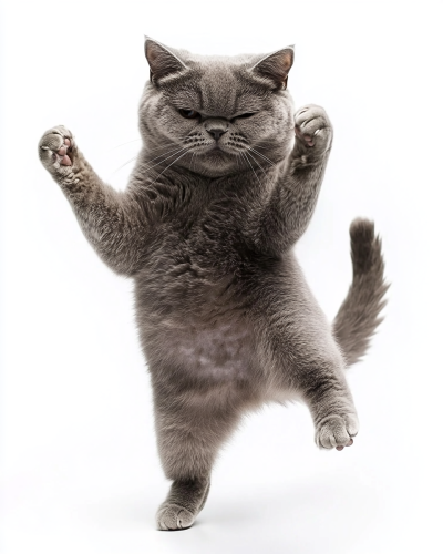 portrait photograph of a stocky british shorthair cat is dancing on the floor, gymnastic posture, lovely expression, isolated on white background --ar 4:5 --style raw