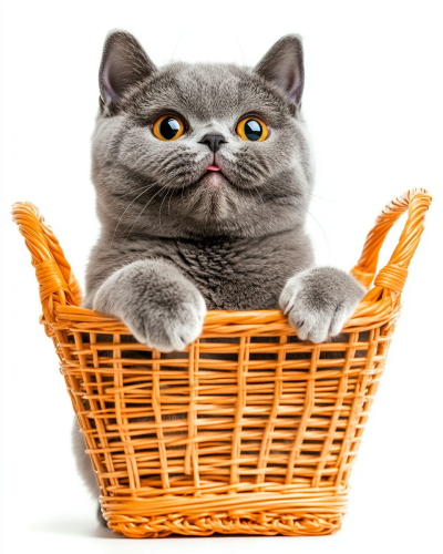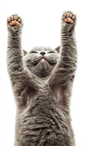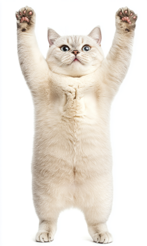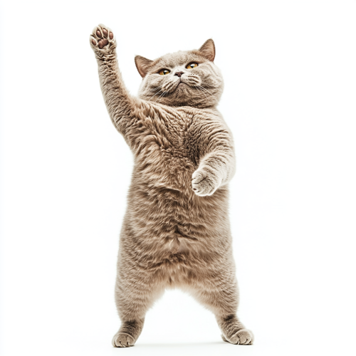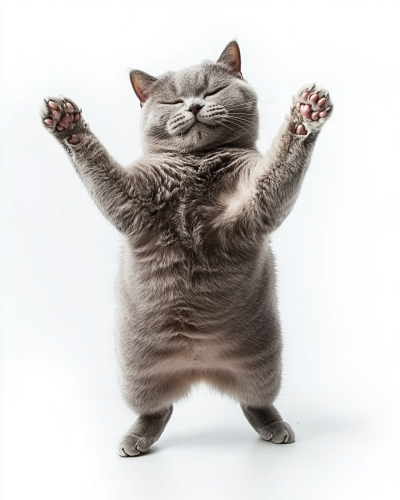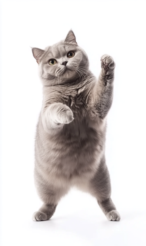 portrait photograph of a stocky british shorthair cat is standing on two legs, he is lifting arms cute posting, happy expression, full lenght shot, isolated on white background --ar 3:5 --style raw