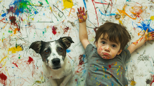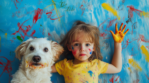 child and dog covered in finger paint with children's drawing all over the blue wall, child is grinning at the camera holding up fingers standing in front of the wall, dog is terrified on the floor and looking at child, photorealistic --ar 16:9