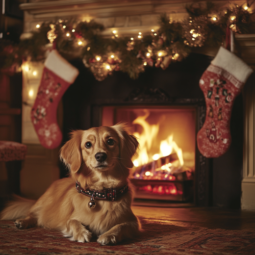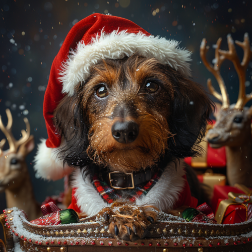 A festive digital composite photograph features a central subject of a textured, dark brown and tan wire-haired Dachshund wearing a traditional Santa Claus costume. The dog is seated in an ornate wooden sleigh filled with an assortment of wrapped gifts in gold and red paper, tied together with silver ribbons. It dons a vibrant red Santa suit with white fur trim and a black belt, complemented by a fluffy red hat adorned with a white pom-pom and delicate snowflakes on its surface. The dog's expressive amber eyes look directly at the viewer, adding to the whimsical mood. Two light brown reindeer with prominent antlers are visible in the foreground, facing slightly towards the camera. They appear to be part of the scene, possibly pulling the sleigh. The background depicts a magical nighttime setting with a large, bright full moon glowing in the upper right corner, casting a soft yellowish light. The moon's surface shows intricate details like craters and rays. A dark navy blue night sky is dotted with numerous twinkling stars and scattered falling snowflakes, creating a serene atmosphere. To the left, there is a faintly visible evergreen tree, contributing to the wintry ambiance. The overall color palette includes deep reds, rich browns, golden yellows, cool whites, and warm blacks, enhancing the holiday spirit and creating a balanced composition with high contrast and saturation --s 750 --v 6.0