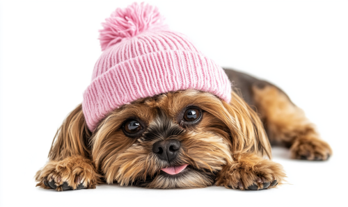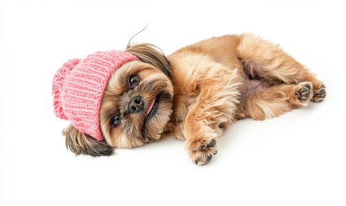 topview portrait photograph of a brown shih-tzu dog with pink beanie, he is lying his back on the floor, variety posture, happy expression, isolated on white background --ar 5:3 --style raw