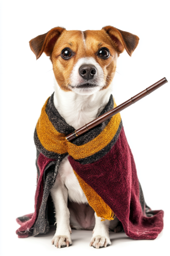 portrait photograph of an adult jack russell dog with gryffindor stundent costume, he is carrying a wand, harry potter movie mood, happy expression, isolated on white background --ar 2:3 --style raw