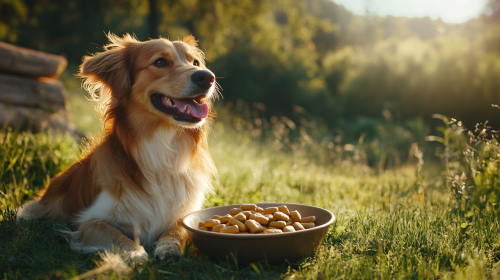Capture a high-end product photo of happy dog sits next to bowl with square treats in an outdoor, side view, with big green grass land, illuminated by naturual sunlight, highlighting the natural colors and textures of the product --ar 16:9
