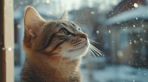 A cute tabby. Looking through the window. Happy. Side view. At home. Natural light. Magazine photo. Depth lens effect. Bokeh effect. Photo direction. Art direction. --ar 16:9 --s 250 --style raw