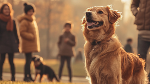 blurry image of a happy couple with a golden retriever with a red vacuum cleaner. The overlay of this image is orange. There are vibrant light elements in this image