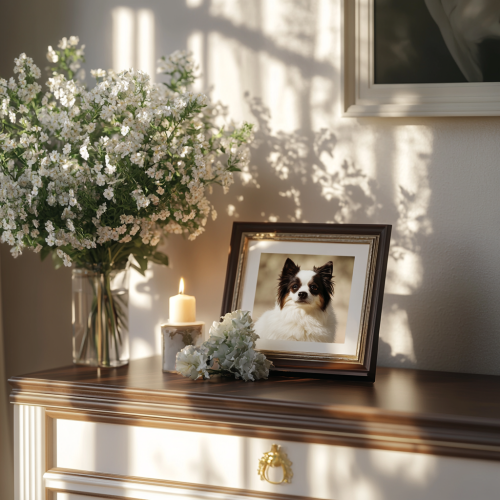 a home altar on a dresser for a deceased pet; country interior, white tones, flowers and a candle in front of an A4 fromat pet portrait framed picture; –v 5 –ar 4:5 –style photorealistic –mood peaceful and cinematic –lighting soft and warm