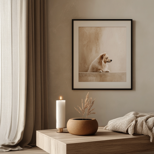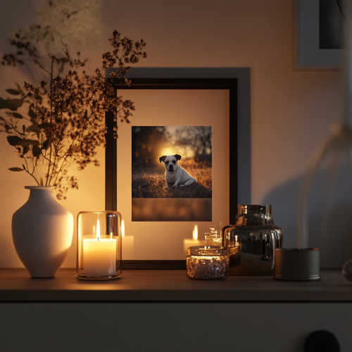 a living room altar on a dresser for a deceased pet; minimalistic interior, neutral tones, candles and an urn in front of an A4 fromat pet portrait framed picture; –v 5 –ar 4:5 –style photorealistic –mood peaceful and cinematic –lighting soft and warm