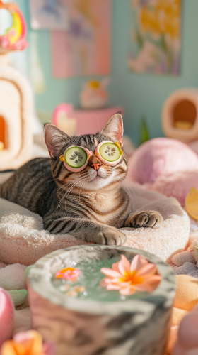 A whimsical spa day for cats, featuring a tabby cat wearing a floral face mask and cucumber slices over its eyes, lying on a heated stone bed. Around it, there are tiny spa amenities like cat-sized mud baths, miniature saunas, and a tiny hot stone massage area. The background is a lush, pastel-colored room with soft, diffuse lighting, and playful, cat-themed artwork on the walls, --ar 9:16