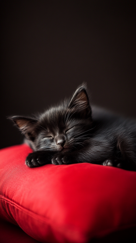 Photorealistic image of black kittens laying asleep on a red pillow in a dark room. Low-key photography style, with dramatic lighting creating deep shadows that highlight the cat’s sleek fur and mysterious expression. Shot with a 50mm lens, f/1.8 aperture for a shallow depth of field, ISO 200, capturing the rich details of the cat’s fur while softly blurring the background. The scene evokes an aura of elegance and mystique. --ar 9:16