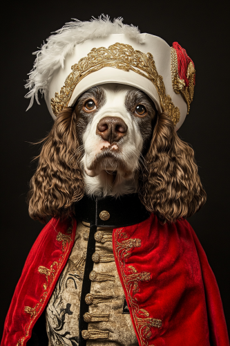 welsh springer spaniel in white tropical helmet and red cape. The cape is style of 1800s English uniform with gold embrodiery and black collar. --ar 2:3 --v 6.1